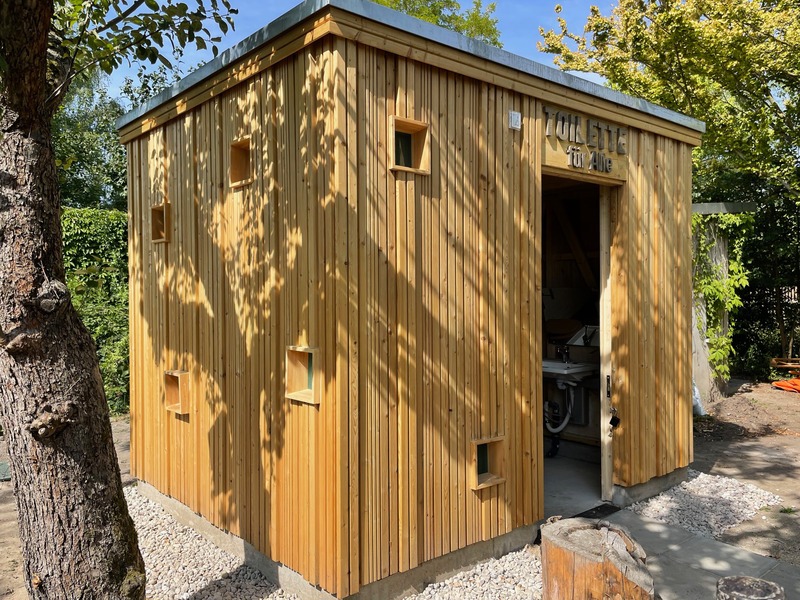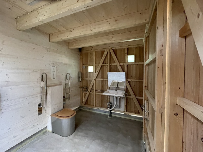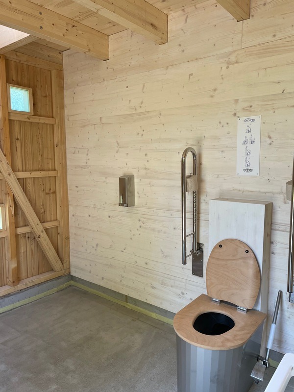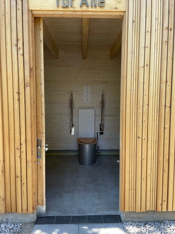 Das Toilettengebäude ist bodengleich verankert, sodass der Innenboden auf gleicher Ebene wie der Außenboden liegt – für barrierefreien Zugang ohne Rampe.