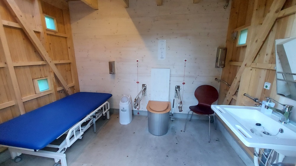 Der Toilettenraum entspricht den Standard einer Toilette für Alle und ist dadurch etwas größer als unsere Standard-KUBUS. Es befindet sich auch eine Pflegeliege in dem Toilettenraum.