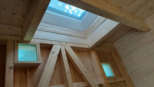Kleine Lichtöffnungen aus recyceltem, türkisfarbenem Milchglas sorgen für eine angenehme Tageslichtbeleuchtung im Innenraum.