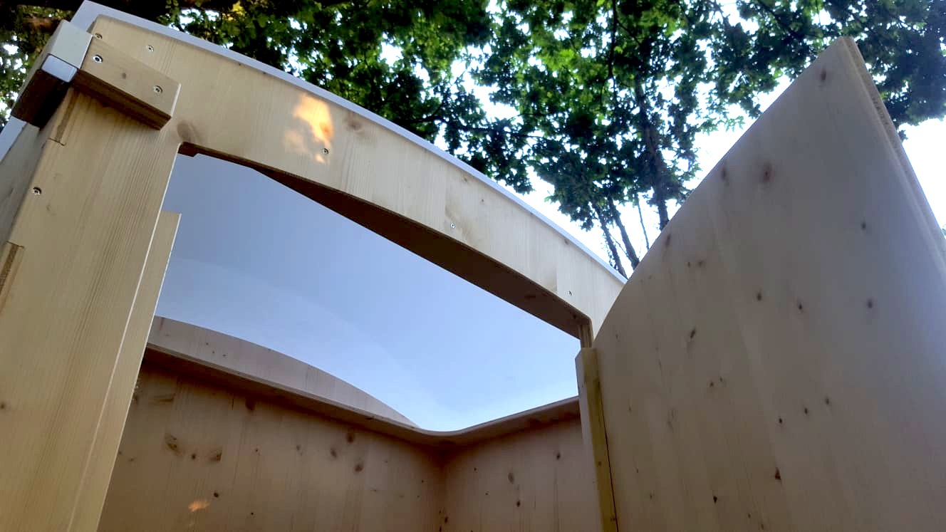 Die Holzbehandlung der außenflächen der Kabine bieten wir optional an, mit der Lasur „Remmers aqua transparent“. Die gleiche Lasur verwenden wir auch für den Boden, jedoch in Palisander."